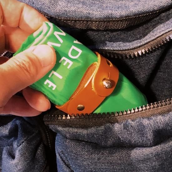 別売りのトートバッッグホルダーは2タイプを用意しました。気軽に持ち歩けるよう製作した「バンドタイプ」と、カバンやリュックなどに取り付ける事が可能な「ハングタイプ」を販売しております。メインでお使いの鞄やリュックの中にレザーホルダーでまとめたトートバッグを入れておくと、急なお買い物やレジ袋変わりにもなり非常に便利です。普段手ぶらで移動することが多いと言う方も、コンパクトに収納されたトートをポケットに忍ばせておけば、エコバッグ代わりに使えるので安心だと思います。