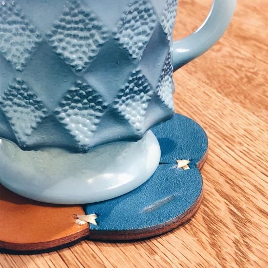 本革にこだわり、ハンドメイドで製作した牛革製コースターです。星柄のデザインが珍しい個性的なコースターに仕上がりました。裏面にも異なるカラーの牛革を張り合わせ厚みを増す事で、星のデザインがより立体的に強調され、非常に存在感があります。カジュアルなハンドステッチも雰囲気があり、ハンドメイドならではの温かさを感じられるキッチン雑貨です。