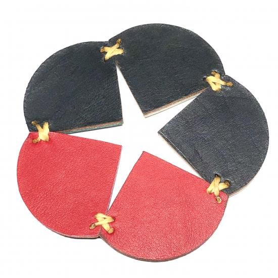 【ネコポスOK】インテリアのアクセントになる一点物の牛革製コースター、レッド×ライトグリーン×シナモン。おうちカフェや来客用におすすめ。